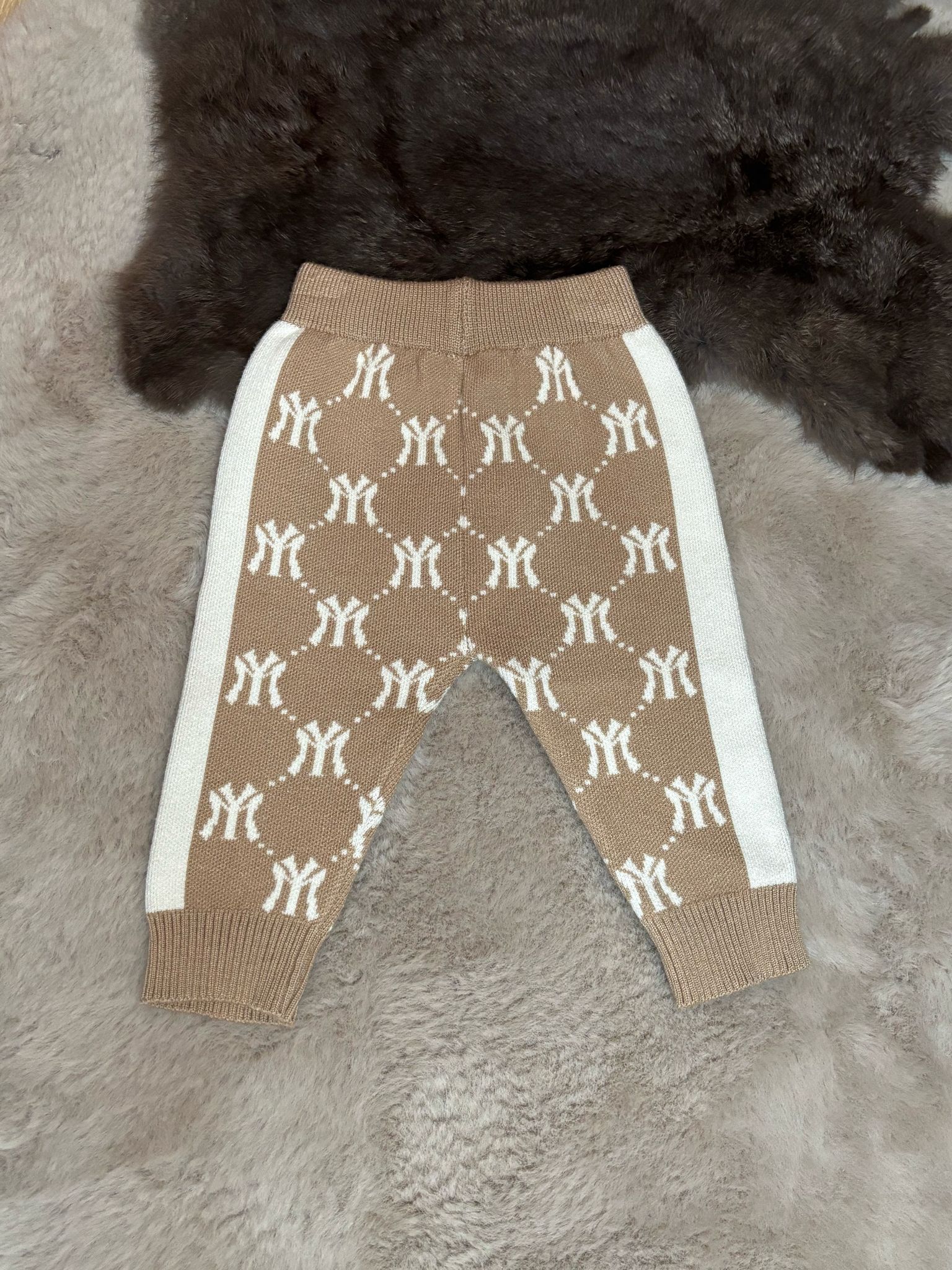 Deze stijlvolle gebreide set in warme beige tint met witte NY-patroontjes is een echte eyecatcher voor de kleintjes. De zachte knitstof zorgt voor comfort, terwijl de houten knoopjes en het speelse patroon zorgen voor een modieuze twist. Perfect voor cozy dagen met een stoere touch!