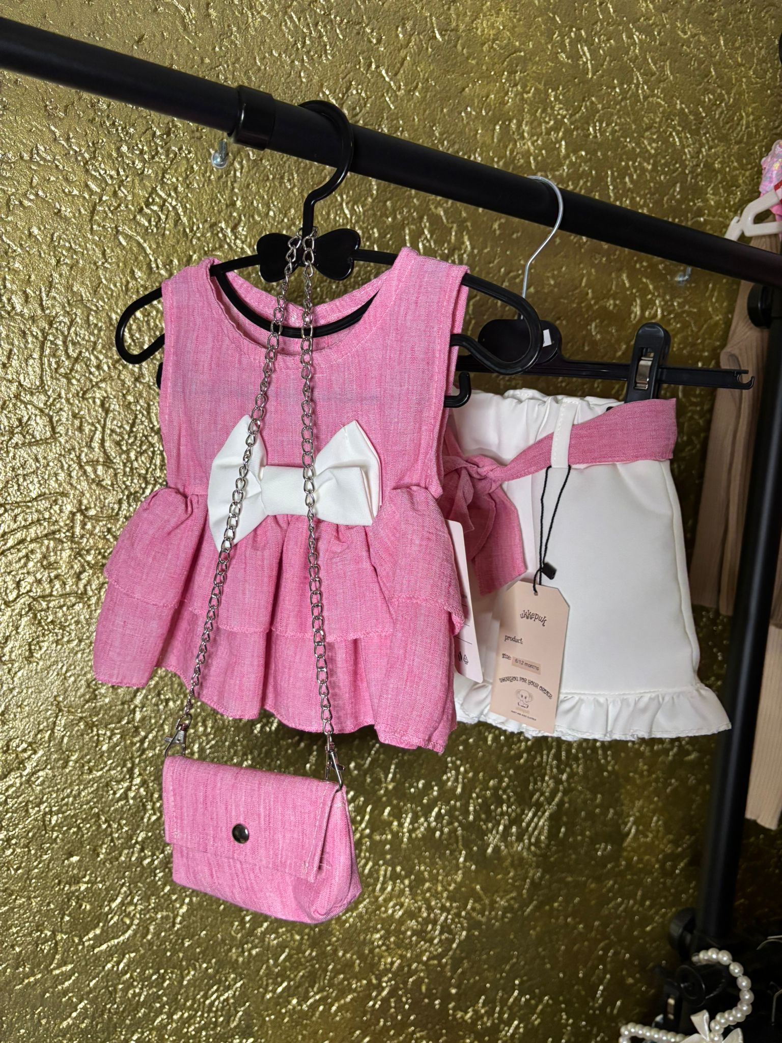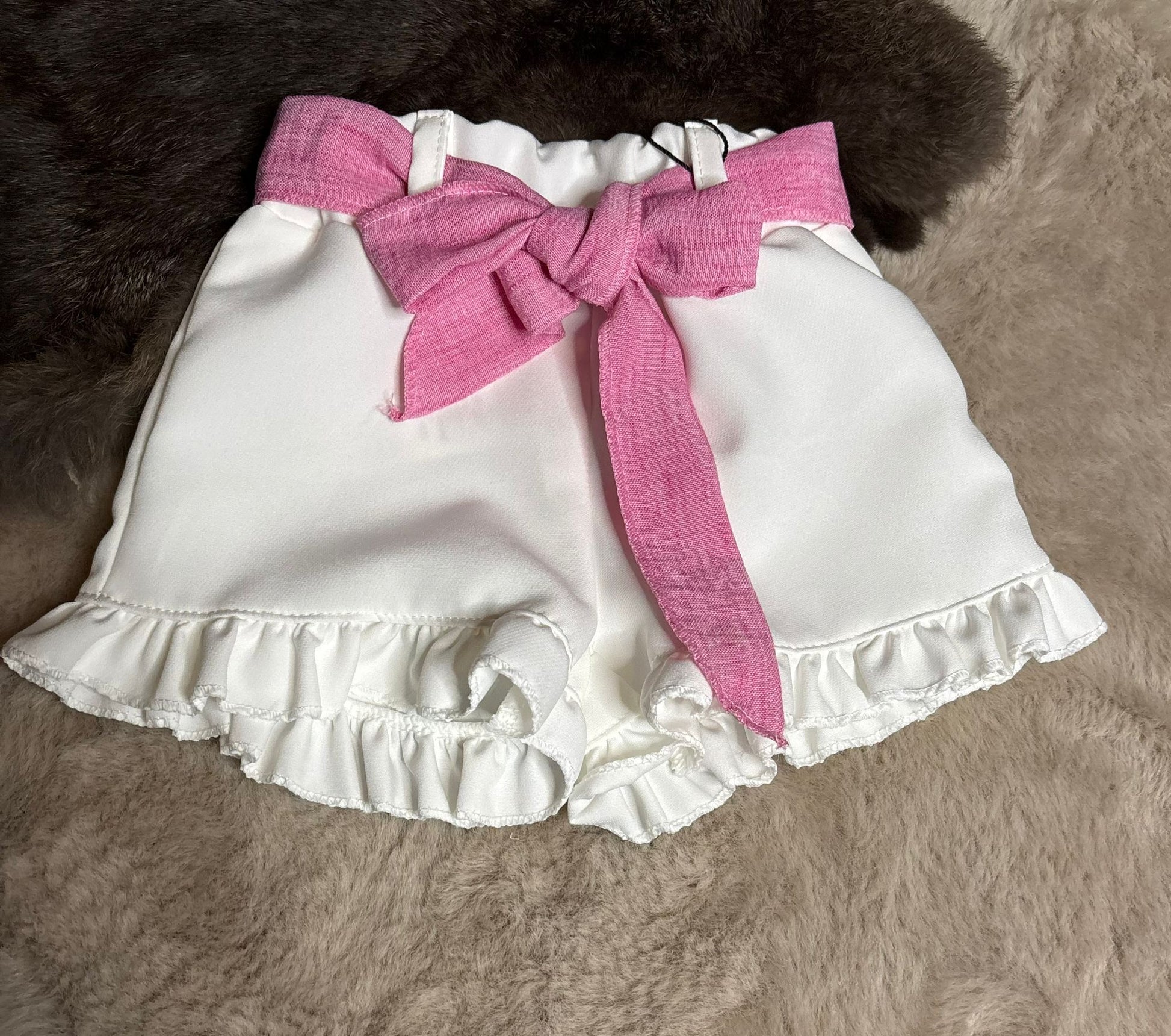 Voor de liefste look van de dag: de roze top met geruffelde onderkant en witte strik & witte broekje met ruffle en roze strik. perfect om in te spelen en te stralen!