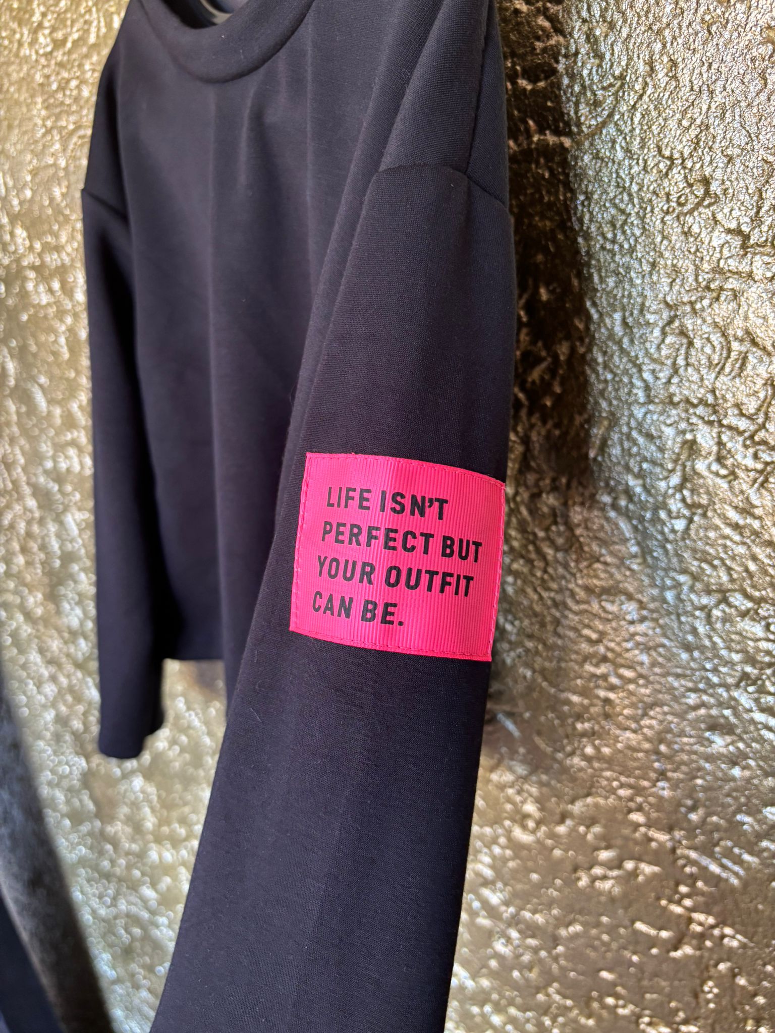 Deze superleuke comfy set is echt een must-have voor elke fashionlover! De zachte stof zit heerlijk, en de coole roze details maken de outfit extra speciaal. Op de mouw en broek staat de tekst “Life isn’t perfect but your outfit can be” — want stijl begint met een goede outfit! 💅